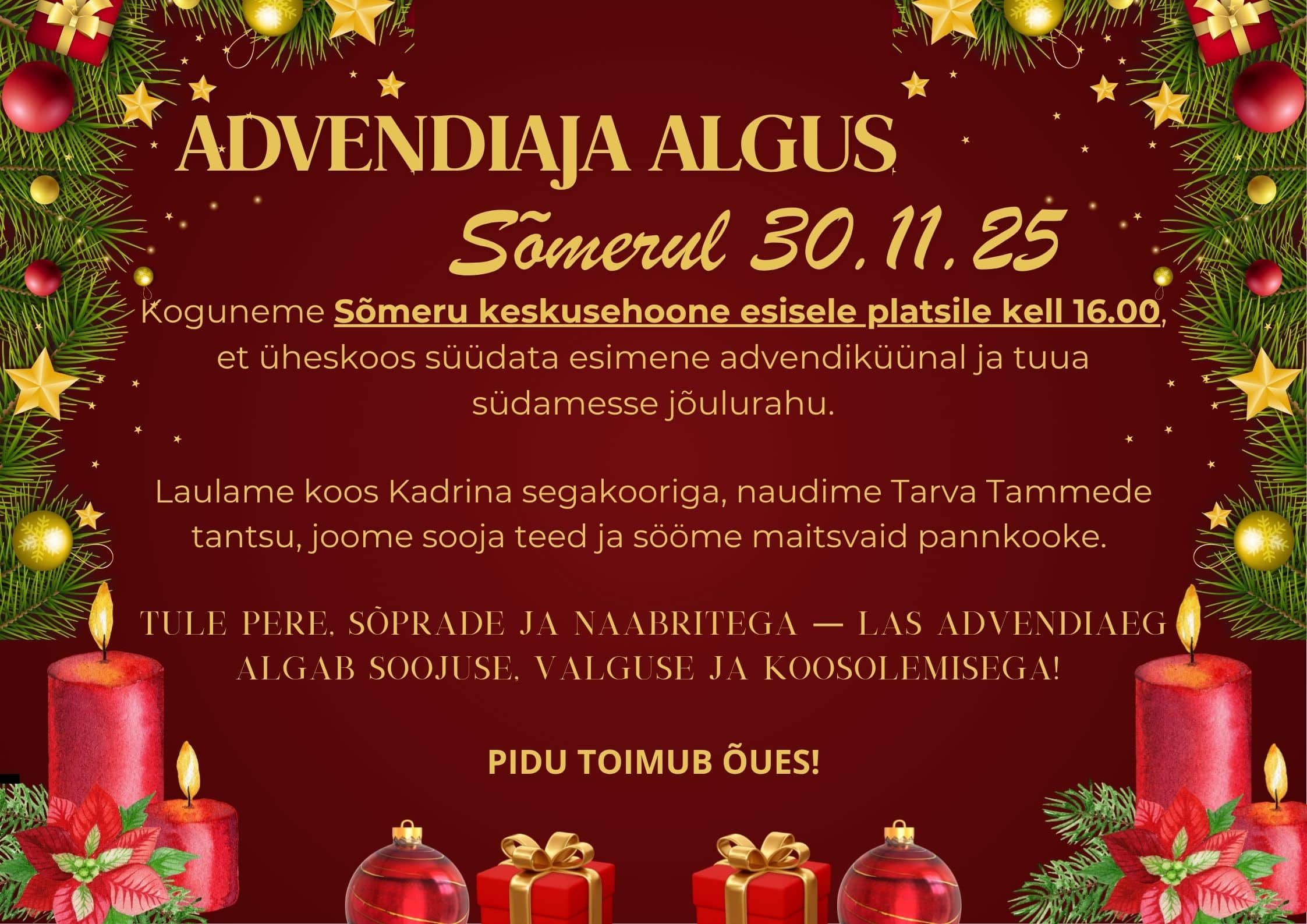 Koguneme Sõmeru keskusehoone ( Kooli 2) esisele platsile kell 16.00, et üheskoos süüdata esimene advendiküünal ja tuua südamesse jõulurahu.