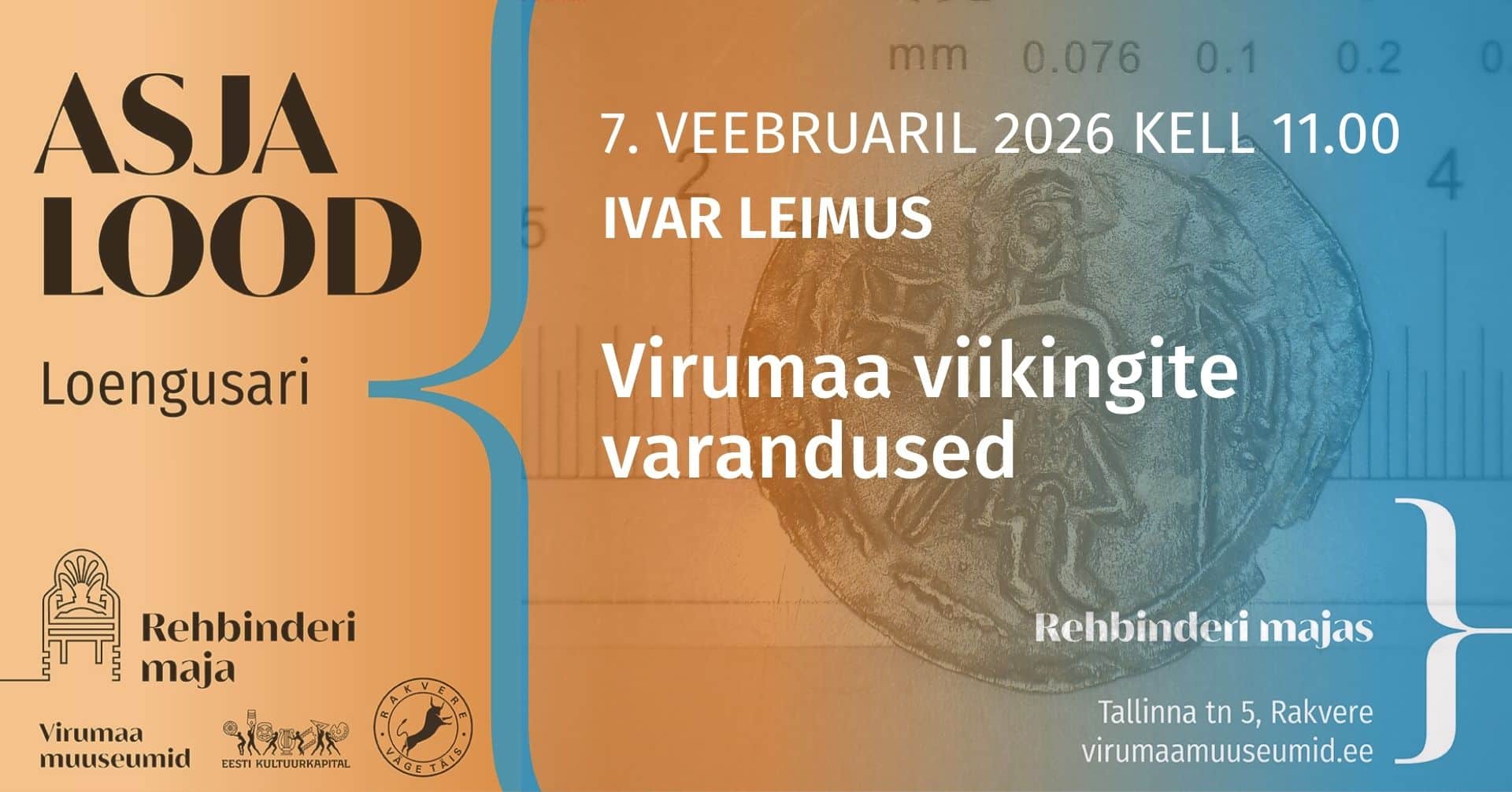 Laupäeval, 7. veebruaril 2026 kell 11.00 ootame huvilisi kuulama ajaloodoktor Ivar Leimuse (Eesti Ajaloomuuseum) loengut „Virumaa viikingite varandused“. Loeng toimub Rakveres Rehbinderi majas (Tallinna tn 5).