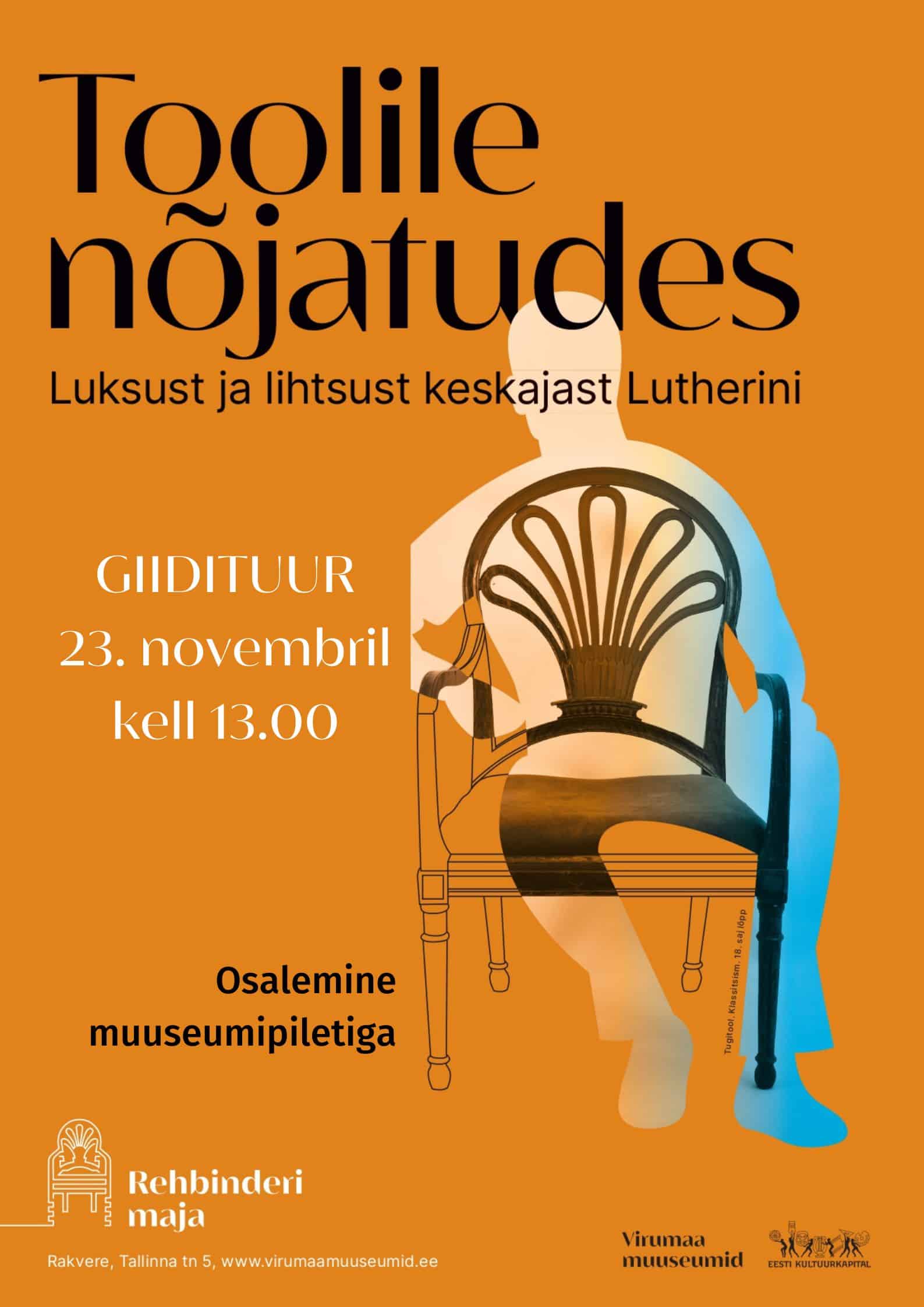 Pühapäeval, 23. novembril 2025 kell 13:00 toimub giidituur Rehbinderi majas mööbliajaloo näitusel “Toolile nõjatudes. Luksust ja lihtsust keskajast Lutheri vabrikuni”. Rehbinderi maja asub Rakveres Tallinna tn 5a. Ootame huvilisi osalema!