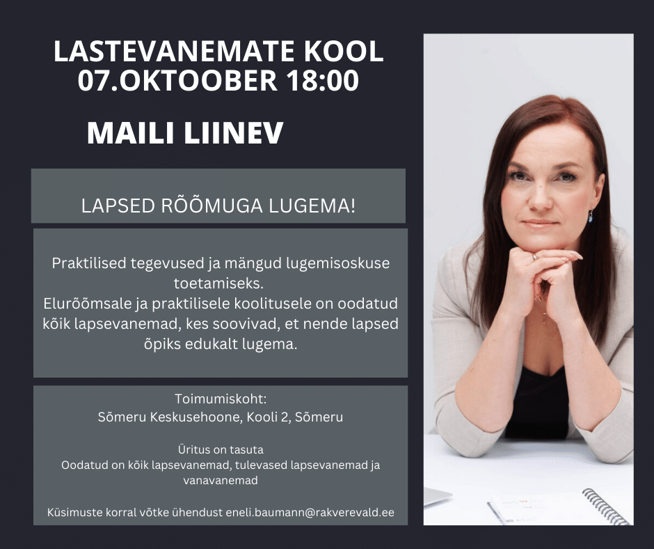Praktilised tegevused ja mängus, et lapsele lugemine toredaks ja meeldivaks teha. Oodatud on kõik lapsevanemad, vanavanemad ja muidu huvilised. Küsimuste korral võta ühendust: eneli.baumann@rakverevald.ee