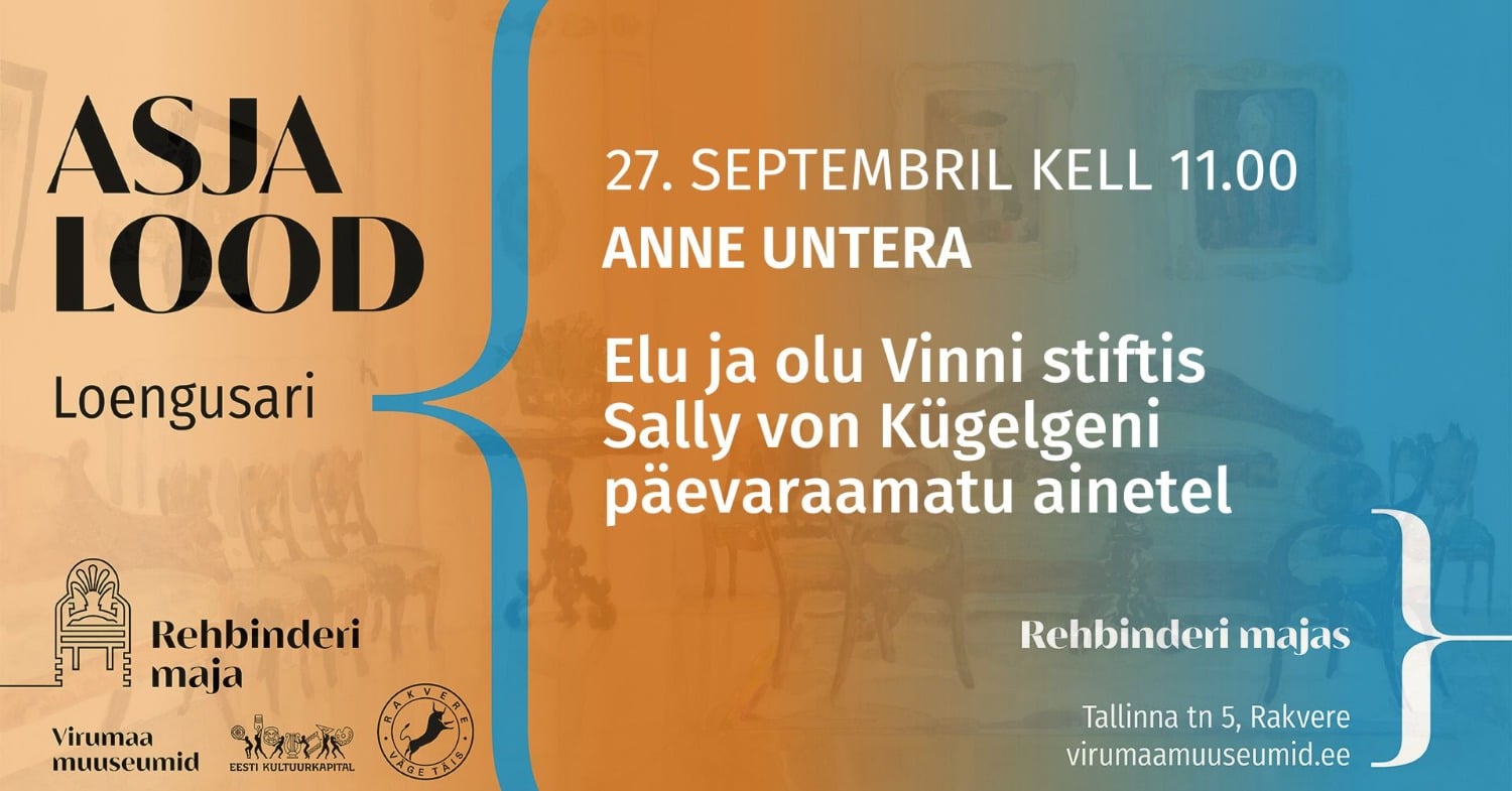 Laupäeval, 27. septembril 2025 kell 11.00 toimub sügisene avaloeng sarjast “Asja lood”. Ootame huvilisi kuulama kunstiteadlase Anne Untera loengut „Elu ja oli Vinni stiftis Sally von Kügelgeni päevaraamatu ainetel”. Loeng toimub Rehbinderi majas Rakveres (Tallinna tn 5). Lisaks saab tutvuda Reet Benderi ja Anne Untera koostatud kunsti- ja kultuuriloolise seinakalendriga 2026 “Sally von Kügelgen. Akvarellid 1853-1860”, mida saab ka muuseumipoest osta.