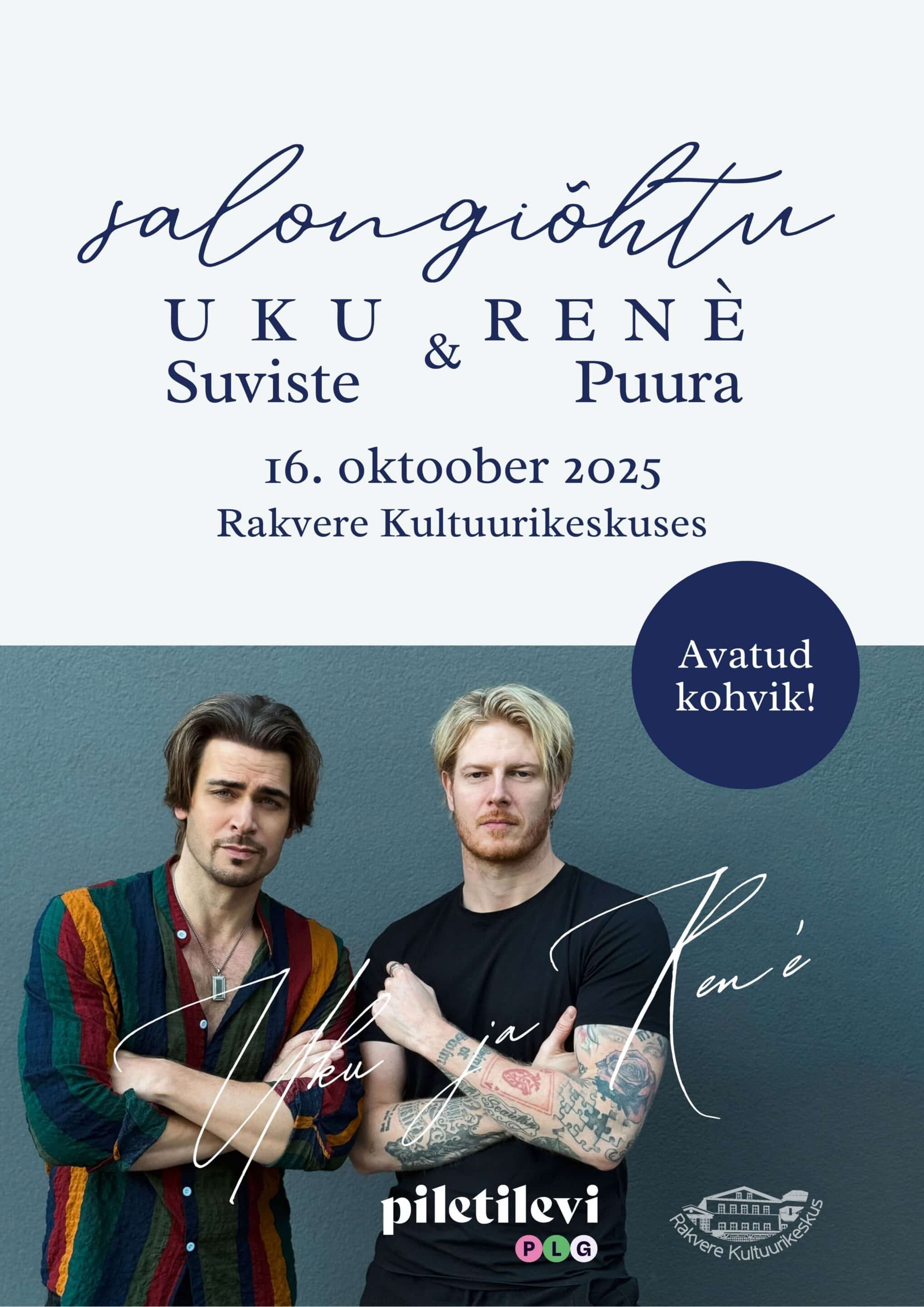 Rakvere Kultuurikeskus kutsub kõiki osa saama erilisest salongiõhtust, kus publiku ette astuvad Uku Suviste ja René Puura.