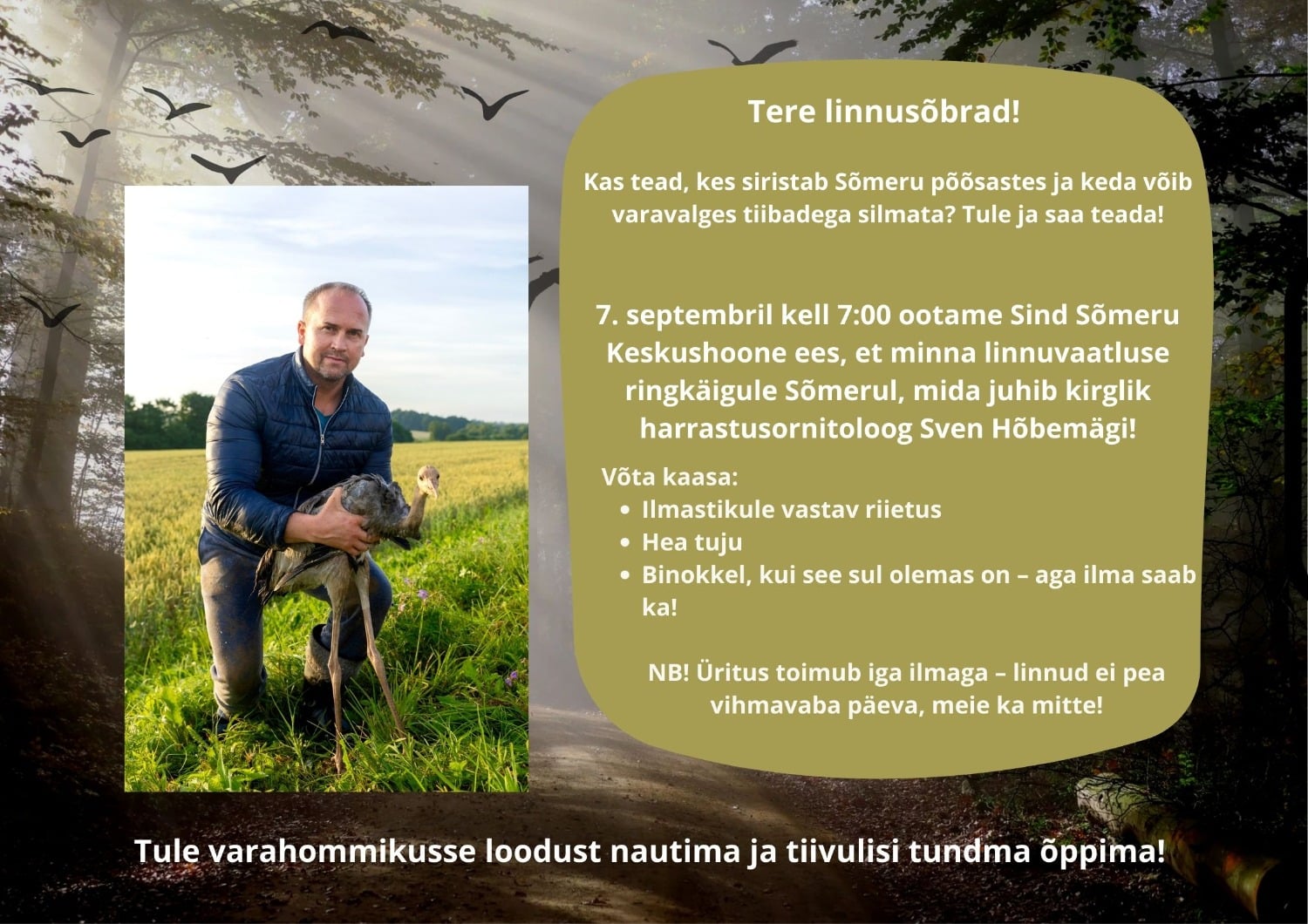 7. septembril kell 7:00 ootame Sind Sõmeru Keskushoone ees, et minna linnuvaatluse ringkäigule Sõmerul, mida juhib kirglik harrastusornitoloog Sven Hõbemägi!