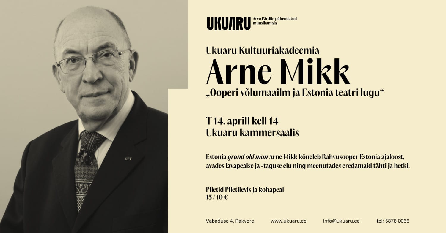 Estonia grand old man Arne Mikk kõneleb loengus Rahvusooper Estonia ajaloost ja ooperi võlumaailmast, avades nii lava pealse kui lavataguse elu ning meenutades eredamaid tähti ja hetki. See on haruldane võimalus kuulda Eesti ooperilugu inimeselt, kes on Estoniaga seotud olnud üle 70 aasta.