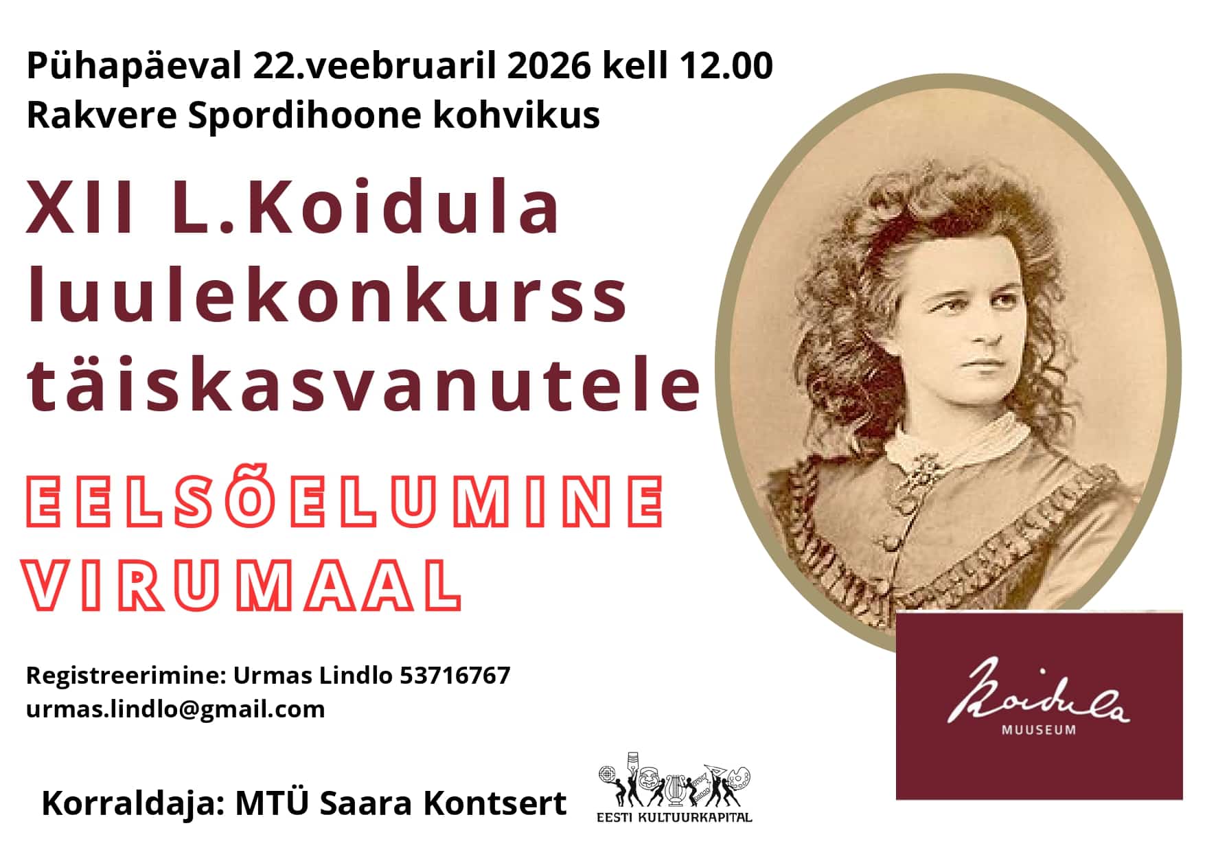 Lydia Koidula on meie rahva jaoks sümbol, kelle sõnadesse on põimitud eestlaseks olemise sügavaim olemus. Juba kaheteistkümnendat korda kuulutatakse välja üleriigiline täiskasvanute Koidula luulekonkurss ning mul on suur rõõm kutsuda Virumaa inimesi osa saama selle sündmuse piirkondlikust eelvoorust.